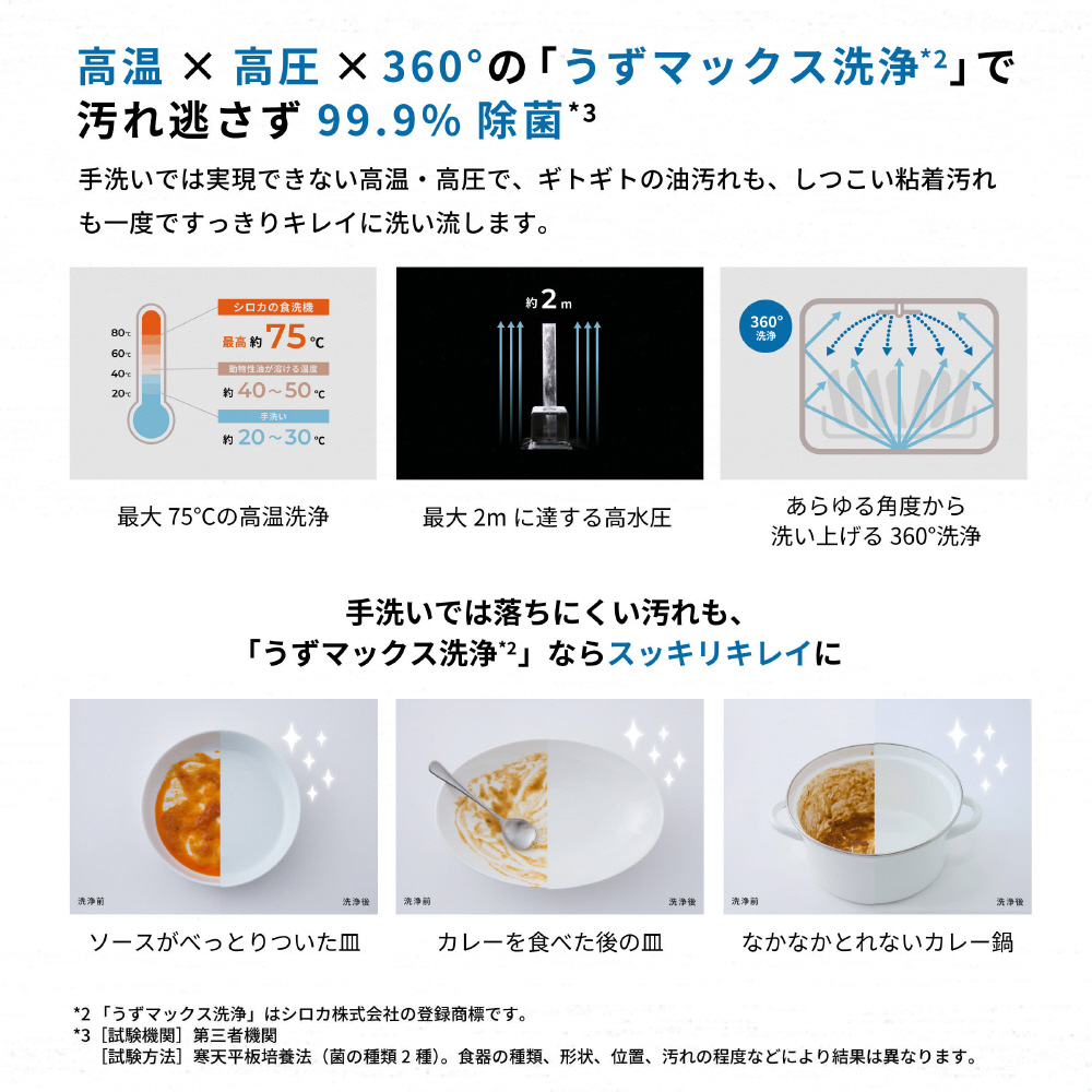 <高温×高圧×360度>の「うずマックス洗浄」で汚れ逃さず99.9%除菌*