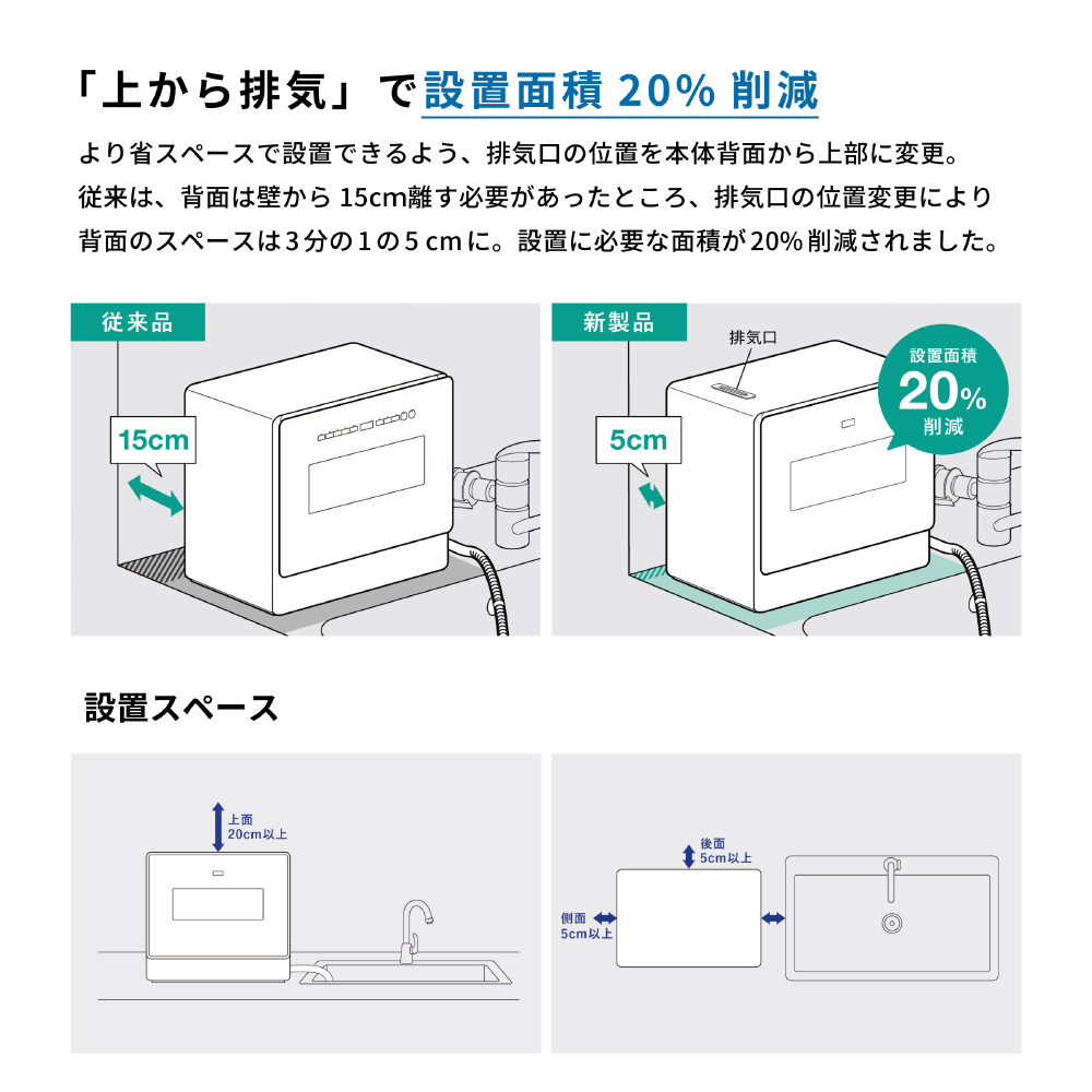 排気口を背面から本体上部に変更することで、背面に必要なスペースを従来の15cmから5cm(3分の1)に縮小。