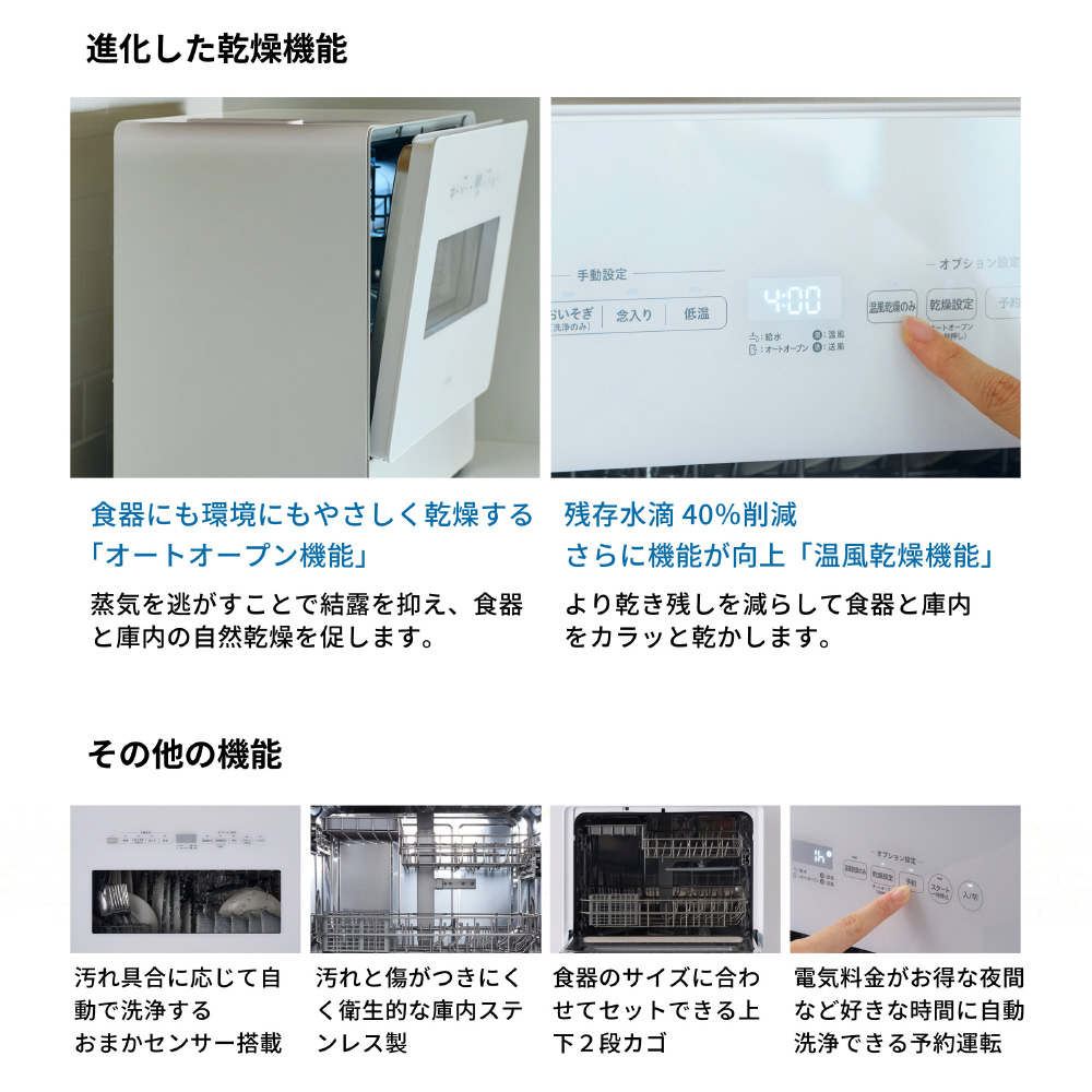 洗浄終了後に自動でドアが開き、蒸気を逃がす機能を搭載。