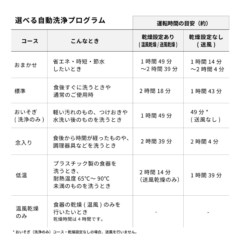 洗浄コース おまかせ、標準、おいそぎ(洗浄のみ)、念入り、低温