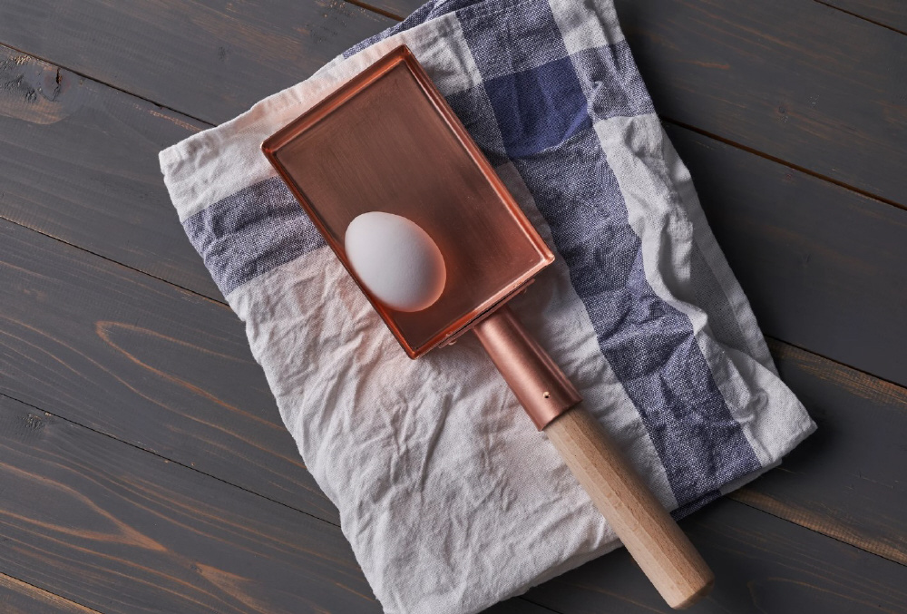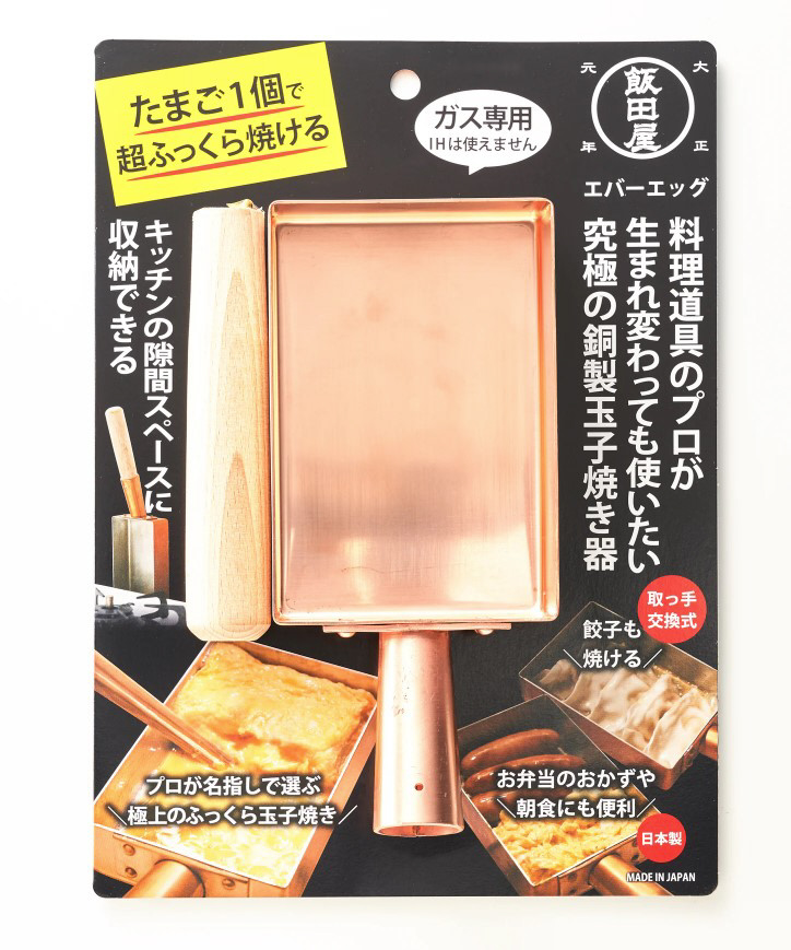 飯田屋オリジナルの究極の熱伝導を持つ銅製玉子焼き器、エバーエッグが誕生しました。ありそうでなかった深型タイプの銅製玉子焼き器。サイズも今までになかった超コンパクトサイズで、卵1個で焼き上げることができます。