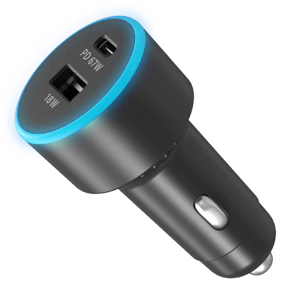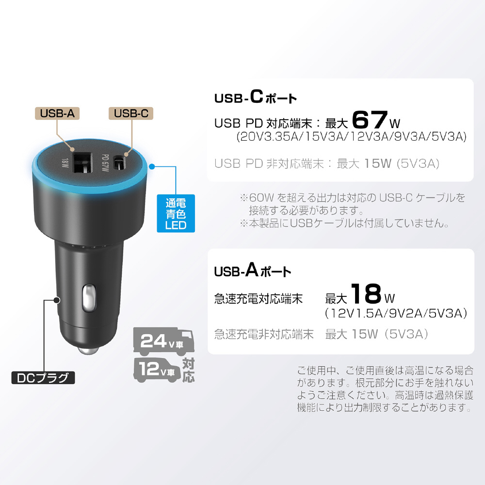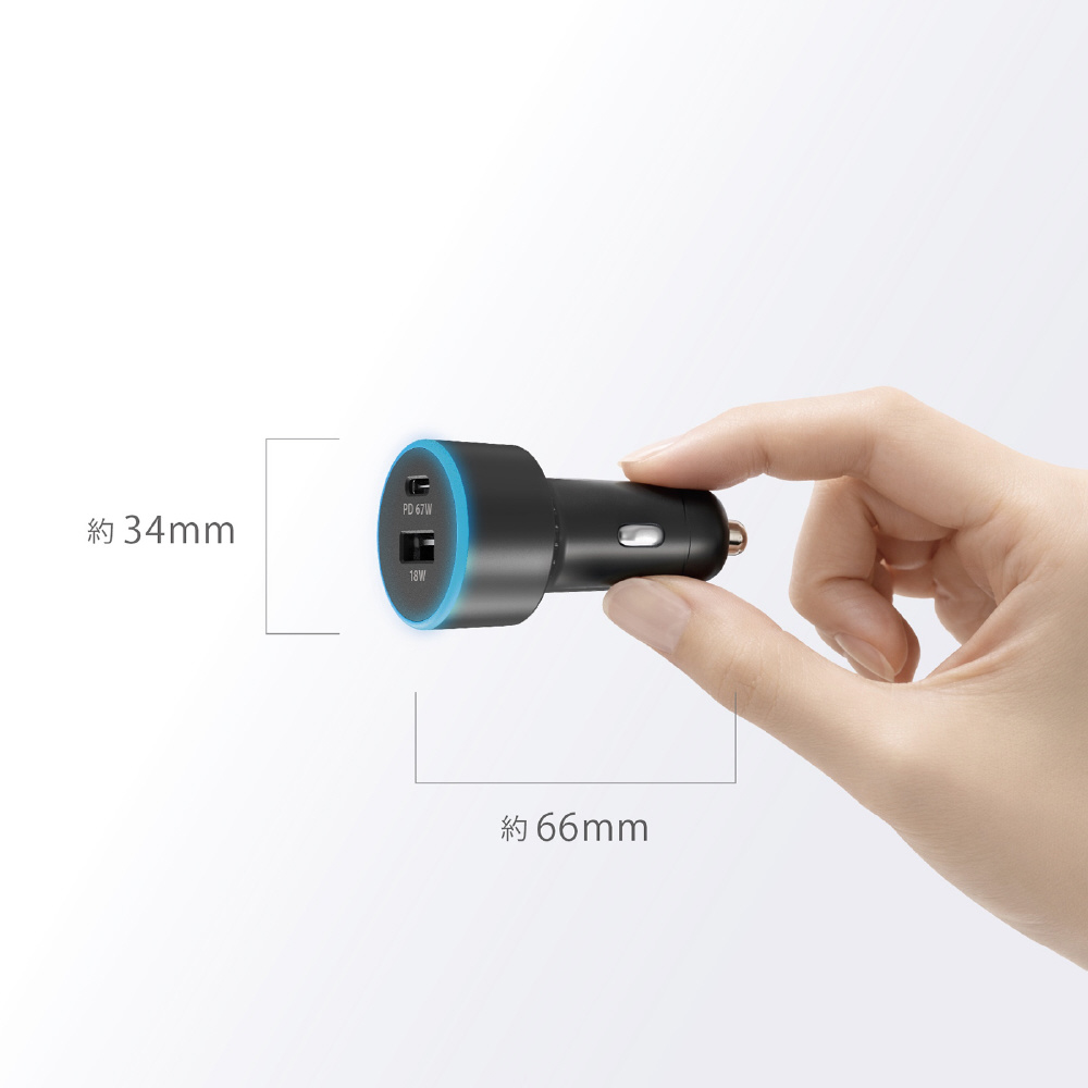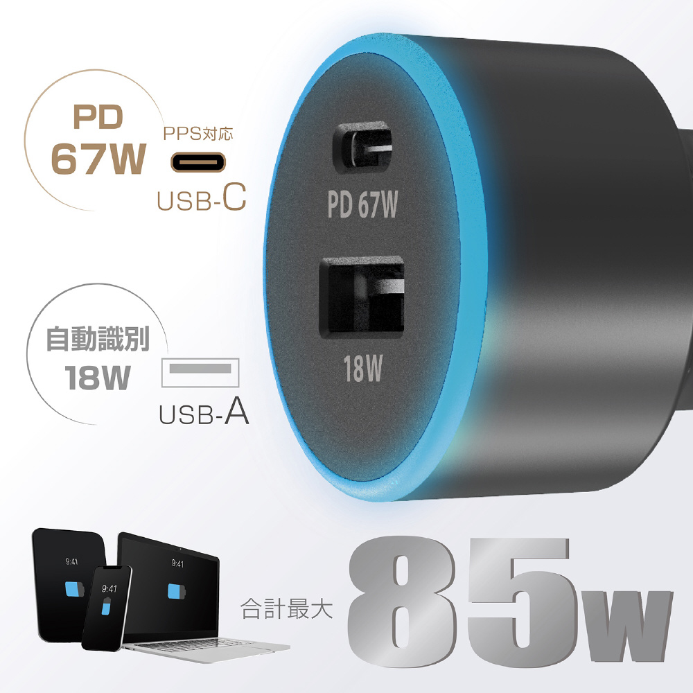 ■車のDCソケット電源からスマホ/タブレット/ノートPCを充電・給電。USB-AとUSB-Cの合計2ポートを搭載し、出力合計最大85Wで高速同時充電。