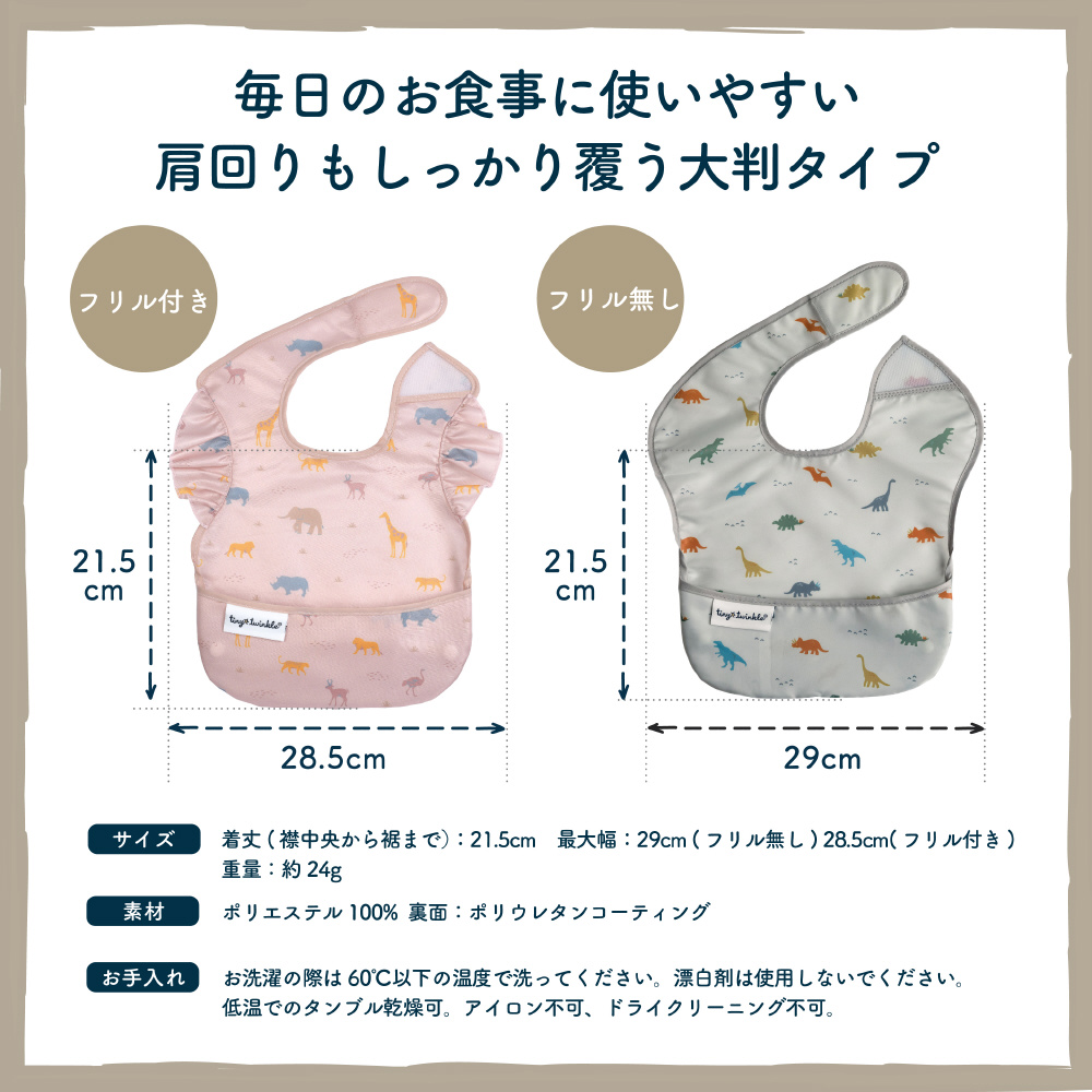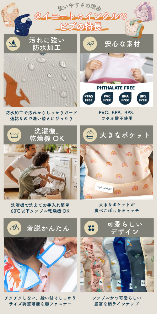 チクチクしない、サイズ調節できる面ファスナー。防水加工で、汚れがにじみにくい素材。洗濯機で洗えてお手入れ簡単。かわいいデザインでお出かけ先でも大活躍!