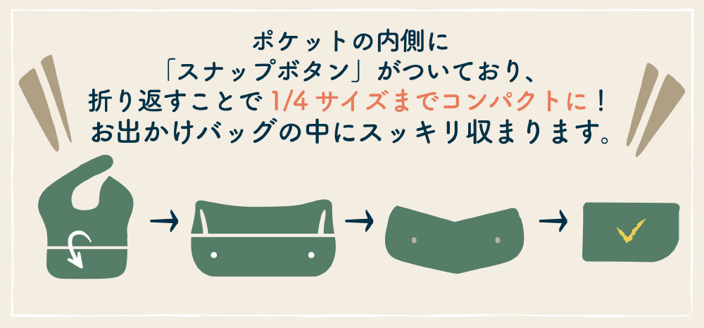 約1/4サイズにコンパクトにたためるスナップボタン付き。お出かけバッグの中にスッキリ収まります。