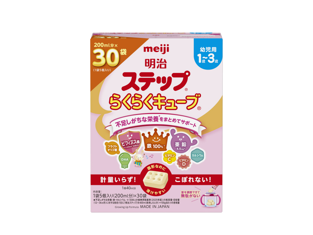 1〜3歳のお子さまに特に大切で、不足しがちな鉄・カルシウム・ビタミンC・ビタミンDを400mlで1日に必要な量の100%摂取できる。・10種のビタミン、亜鉛は70%サポート・食事摂取基準2025年度版対応・国内フォローアップミルクの中で、唯一ビフィズス菌と亜鉛の両方配合。・キューブタイプなので、計量不要。育児負担の軽減に貢献する。