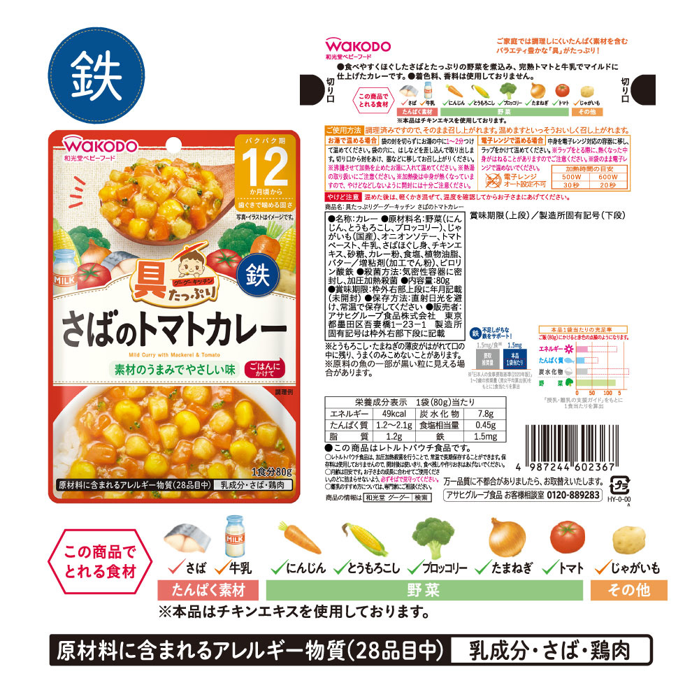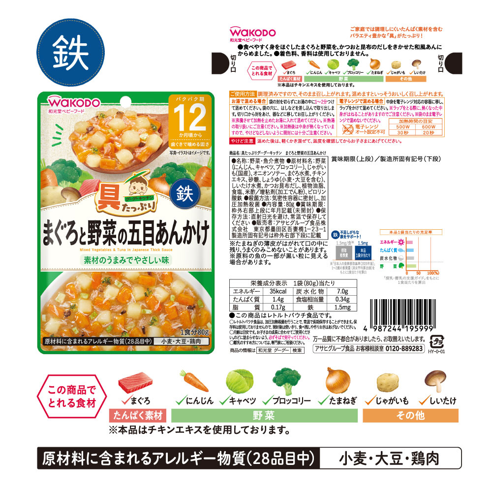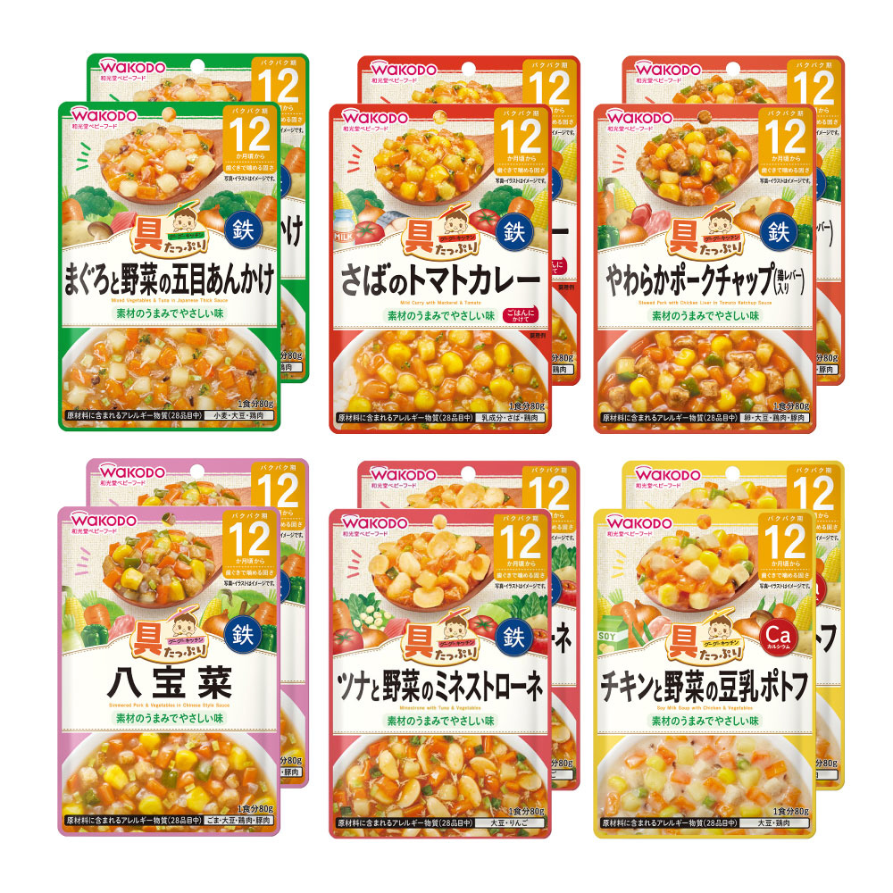 人気メニューを中心に、魚、肉などたんぱく素材や味付けがバラエティに富んだメニューを揃えました。【まぐろと野菜の五目あんかけ、さばのトマトカレー、やわらかポークチャップ(鶏レバー入り)、チキンと野菜の豆乳ポトフ、八宝菜、ツナと野菜のミネストローネ】【具たっぷりグーグーキッチン まぐろと野菜の五目あんかけ】食べやすく身をほぐしたまぐろと野菜を、かつおと昆布のだしをきかせた和風あんにからめました。着色料、香料は使用しておりません。【具たっぷりグーグーキッチン さばのトマトカレー】食べやすくほぐしたさばとたっぷりの野菜を煮込み、完熟トマトと牛乳でマイルドに仕上げたカレーです。着色料、香料は使用しておりません。【具たっぷりグーグーキッチン やわらかポークチャップ(鶏レバー入り)】豚肉とレバーをふんわりやわらかく練って、野菜と一緒に煮込みました。お子さまの好きなやさしい甘さのケチャップソース味で、食べやすく仕上げています。着色料、香料は使用しておりません。【具たっぷりグーグーキッチン チキンと野菜の豆乳ポトフ】鶏肉をふんわりやわらかく練って、野菜と一緒に豆乳とチキンブイヨンでコトコト煮込んだ、やさしい味わいのポトフです。着色料、香料は使用しておりません。【具たっぷりグーグーキッチン 八宝菜】豚肉をふんわりやわらかく練って、たっぷりの野菜と一緒に鶏ガラ・ほたてからとったスープで煮込んだ、彩り具材入り八宝菜です。着色料、香料は使用しておりません。【具たっぷりグーグーキッチン ツナと野菜のミネストローネ】ツナとたっぷりの野菜、ふっくらお豆も入った、具だくさん完熟トマトのミネストローネです。着色料、香料は使用しておりません。