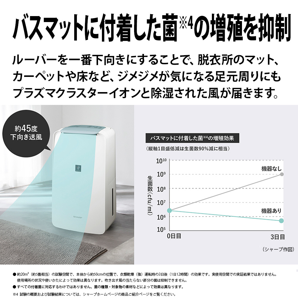 コンパクトながら7.1L/日の除湿能力とプラズマクラスターで部屋干し衣類の気になる匂いを抑制しながらしっかり乾燥。床方向へ送風できる新下吹きルーバーで脱衣所のマットなど、ジメジメが気になる足元周りへプラズマクラスターイオンと除湿された風を届け、バスマットの乾燥、付着した菌の増殖を抑制します。