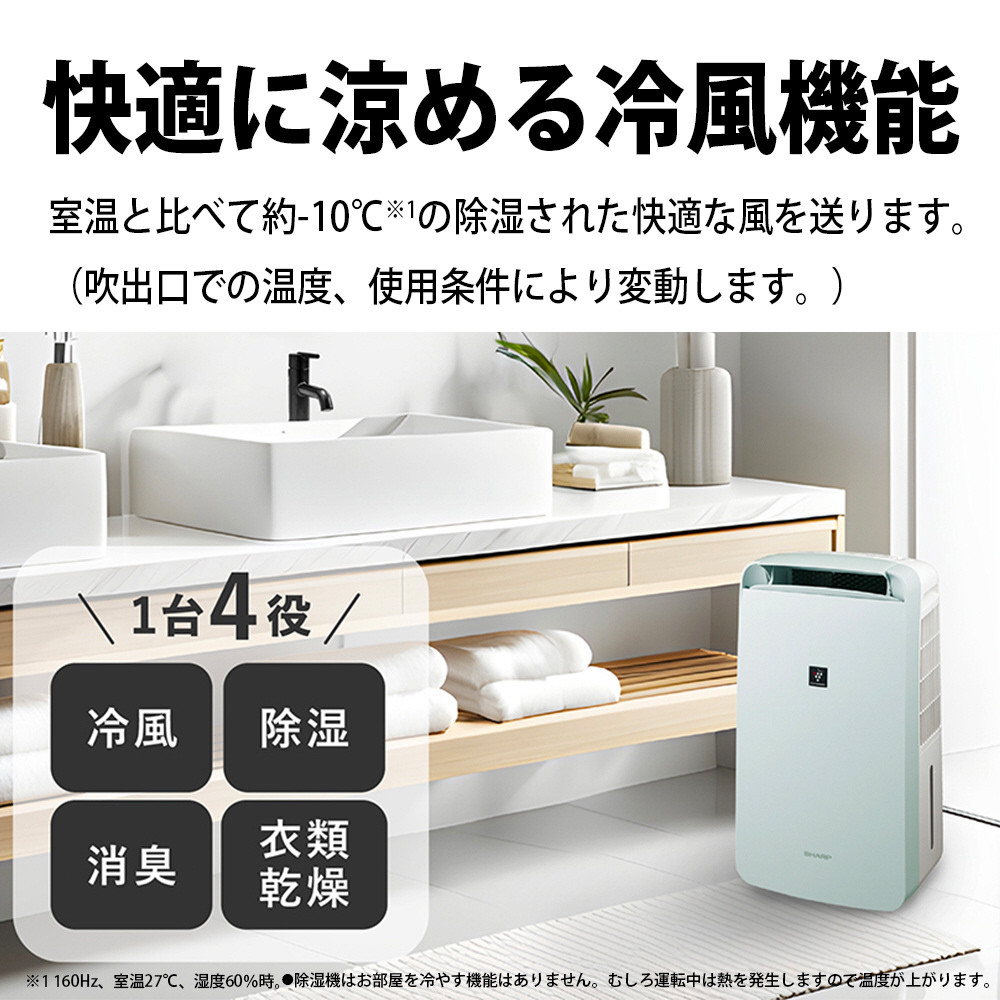 室温と比べて約-10℃の除湿された快適な風を送ります※。お風呂上りの脱衣所やキッチンなどエアコンの風が届かない場所で自分の身の周りを涼しくできます。キャスター付きで移動もラクラク。