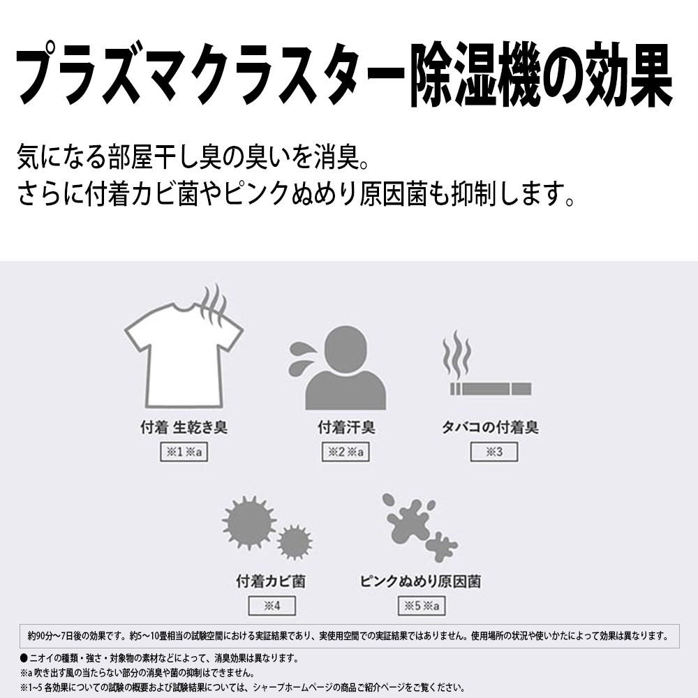 ※1 約20立方メートル(約5畳相当)の試験空間での除湿運転時の7日後(1日24時間)の効果です。実使用空間での実証結果ではありません。使用場所の状況や使いかたによって効果は異なります。