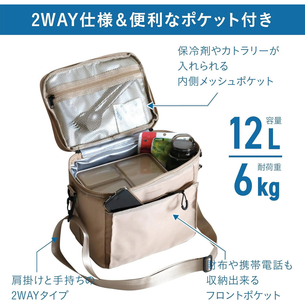 フタの部分には持ち手が付いており、付属のショルダー紐を取り付ければショルダーバッグに早変わり。肩掛けと持ち手の2WAYでお使いいただけます。財布や携帯電話を収納出来る外ポケットと、保冷剤やカトラリーを入れられる内ポケット付き。