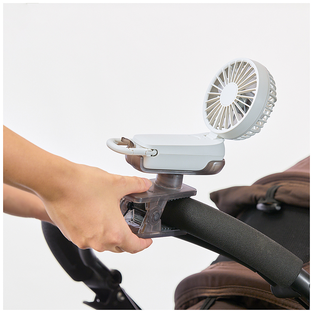 ■大きなクリップでベビーカーなどに固定し、回転するので方向を変えられます。