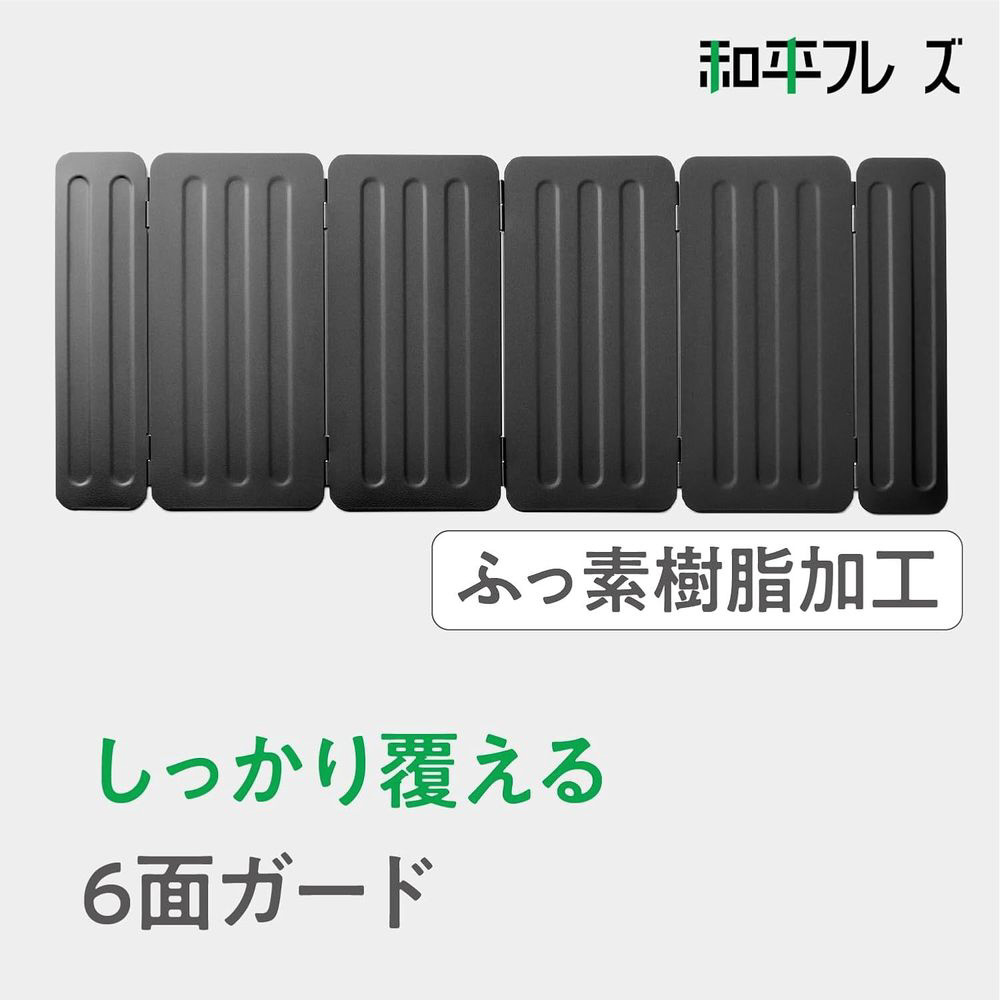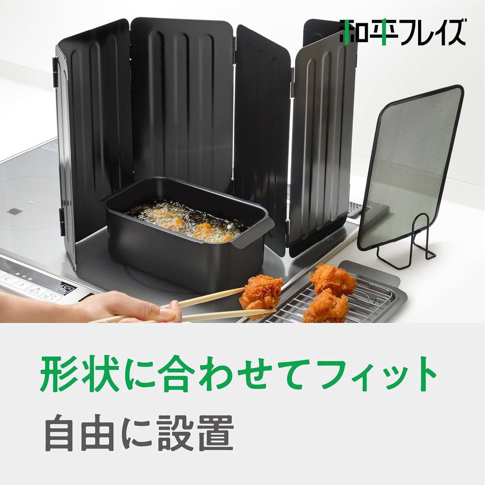 揚げ物や炒め物をする際に油跳ねを防ぐ、6面のオイルガードです。両端は小さめの面なので、鍋やフライパンを囲みやすい形状です。さっと汚れを拭けて使い終わった後もお手入れ簡単!本体は薄く折りたたむことができ、使わない時の置き場所にも困りません。本体を広げると2口コンロ分の長さになるので、広範囲の油跳ねを防ぐことができます。