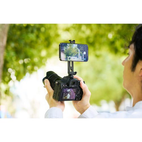 一眼レフカメラ上部にあるアクセサリーシューに取り付け、ネジで締めて固定することが可能。一眼レフカメラで写真を撮りながら、スマートフォンで同時に動画の撮影ができます。