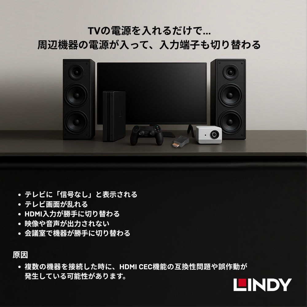 HDMI機器同士の連動機能を制御し、接続トラブルを解消するプロ仕様のCEC遮断アダプタです。テレビやサウンドバー、PCなどの間で意図しない電源のオン・オフや入力切替が発生する「CEC競合問題」を、物理的に信号をカットすることで解決します