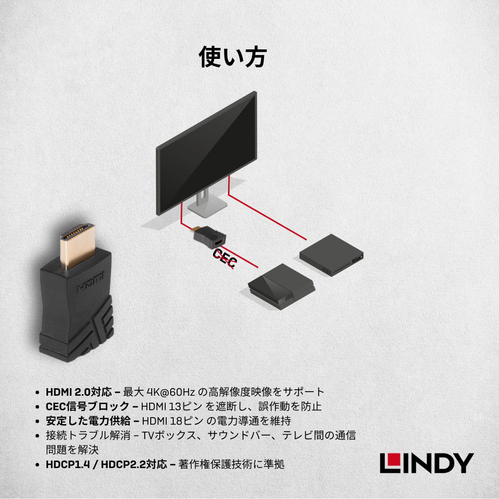 HDMIケーブル内の13番ピンで伝送されるCEC(Consumer Electronics Control)信号のみをピンポイントで遮断します。