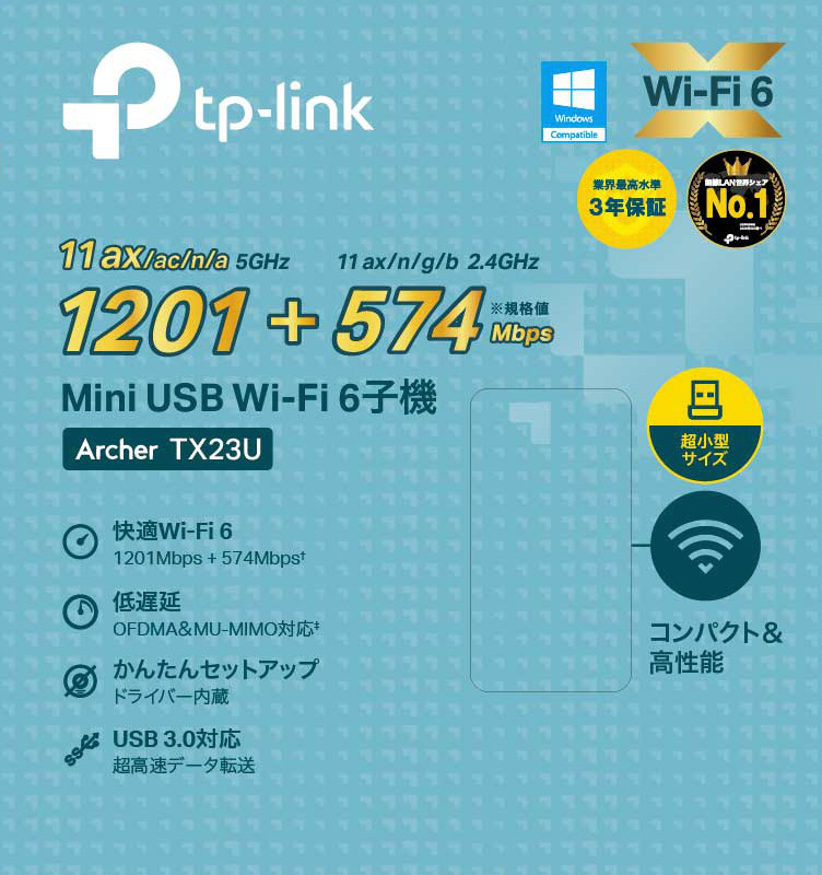 挿すだけ簡単、高速で安定したWi-Fi 6環境へ。AX1800コンパクトUSBWi-Fi 6子機無線LAN子機Archer TX23U