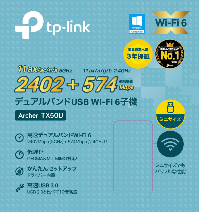 Wi-Fi 6×最大3000Mbps、低遅延・高セキュリティ通信に。AX3000コンパクトUSBWi-Fi 6子機Archer TX50U