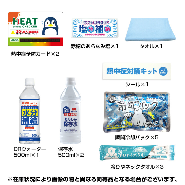 アルミクーラーバック、保存水×2、水分補給ORウォーター×1、熱中症予防カード×2、シール×1、赤穂あらなみ塩×1、瞬間冷却パック×5、冷ひやネックタオル×3、マイクロファイバータオル×1