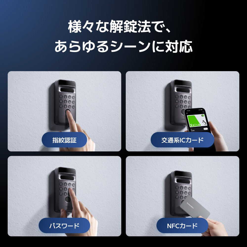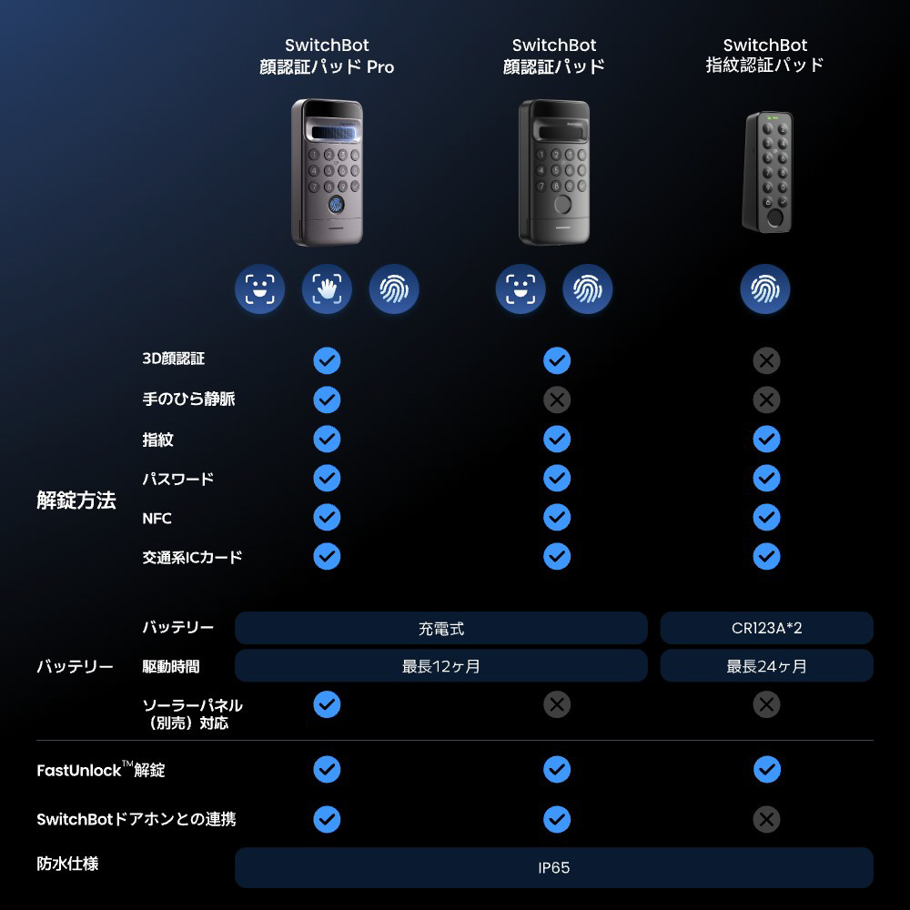 ・iPhoneと同じ3D顔認証で1秒以内のスピード解錠 ・静脈解錠機能付き、手をかざすだけで家族みんなにやさしい ・3Mテープで貼り付けるだけで、配線や工事は不要 ・1度の充電で1年間使用可能*。モバイルバッテリーを挿し込んでの充電や、ソーラーパネル(別売)での給電も ・パスワードや指紋認証はもちろん、交通系ICからもスムーズに解錠 *解錠・施錠を1日に各10回ずつ行なった場合