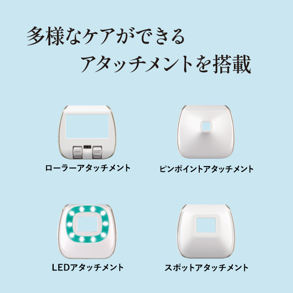 眉間・おでこ・小鼻など細かい部分もケアできるアタッチメント。照射口が四角形のため、打ち漏れを防ぎケアしやすい。サロン経験者にもおすすめ