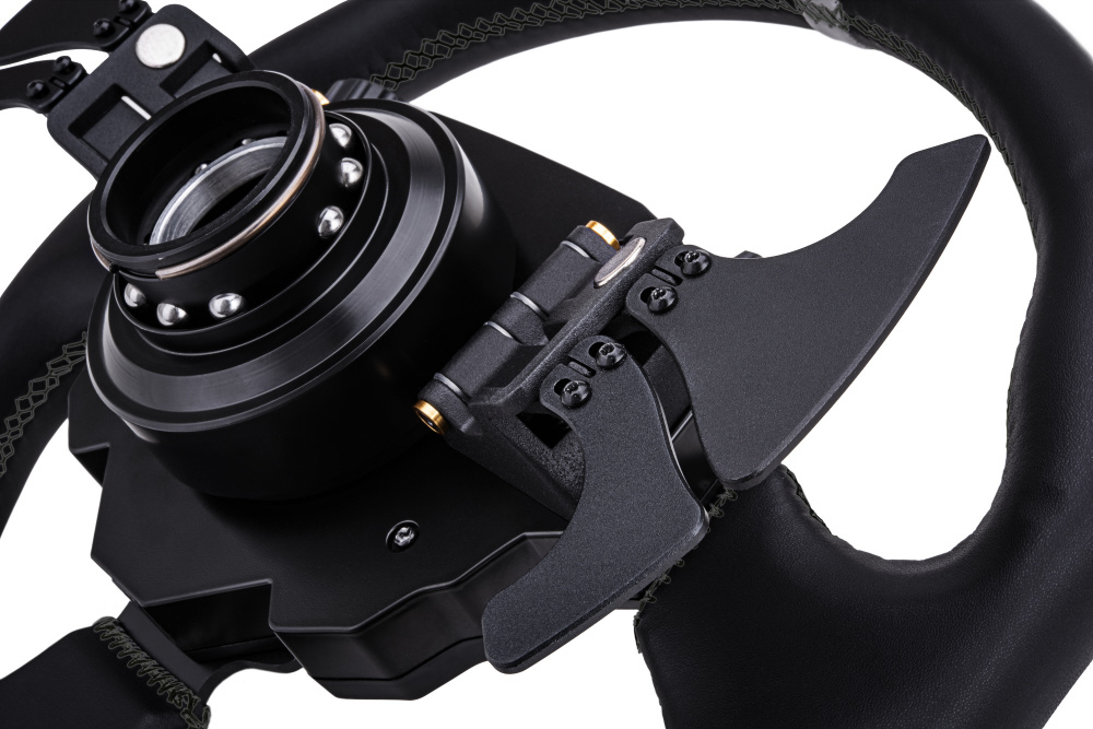 ■13インチのステアリングホイールはクイックリリース設計とデュアルクラッチパドルを備え、素早くレスポンシブな操作感を提供。
