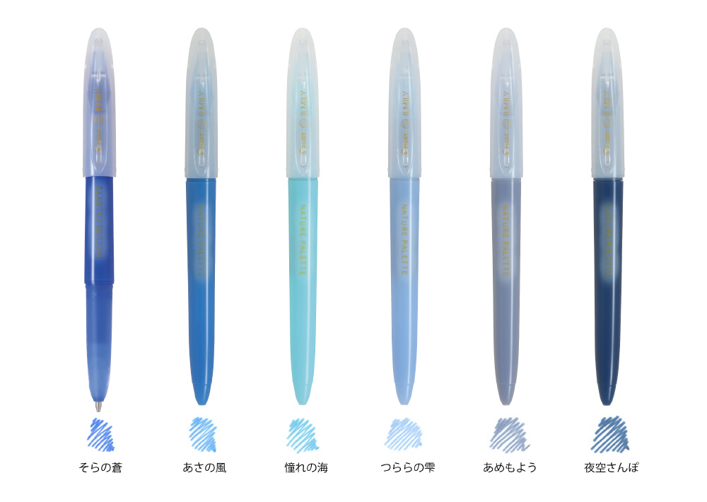 ILMILY I Like Me, I Like You NATURE PARETTE ネイチャーパレット あなたのすぐそばにゆらぐ、あおいろ景色。 身近なあおいろ景色を連想させるような、自然の微細な青色の違いを楽しむことができます。 筆跡に濃淡が出る新開発の低粘度インキと1.0mmの太字を採用しており、万年筆のような筆跡を手軽に体験できます。