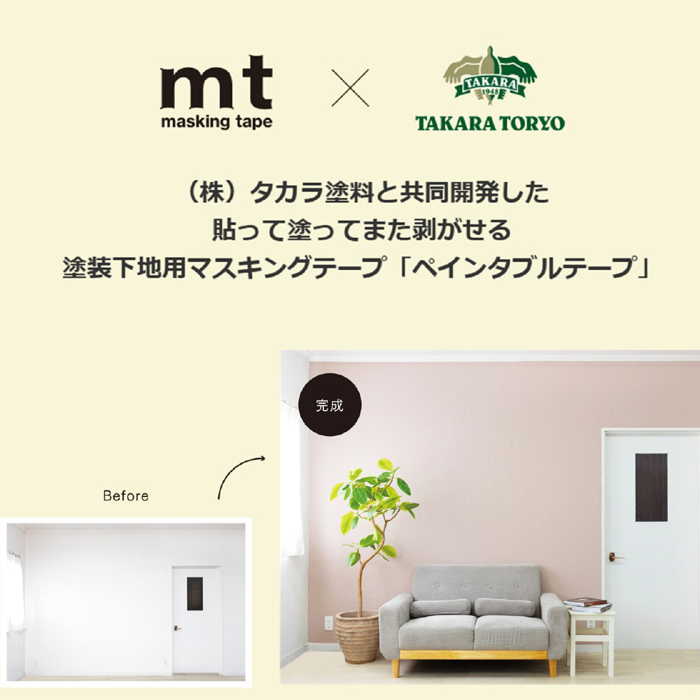 (株)タカラ塗料と共同開発した貼って塗ってまた剥がせる塗装下地用マスキングテープ「ペインタブルテープ」。このテープの上から塗装すれば、原状回復が必要な賃貸住宅の壁紙でも好きな色に変えることができます。賃貸だからDIYできない、と諦めていた方へ。ペインタブルテープを使って、自由な色選びを楽しみませんか?