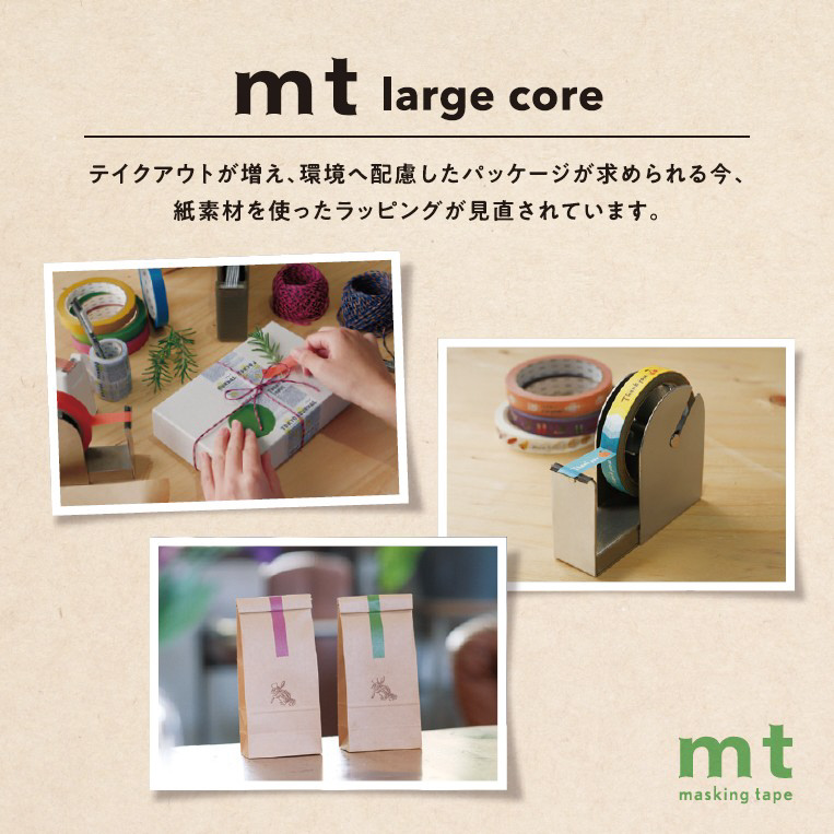 通常のマスキングテープより粘着力を高めた、強粘着タイプ。ナチュラルな色彩とやさしい質感が美しい無地の太芯テープです。お弁当や紙袋のふ「封留め」に最適!既存のテープカッターにセットして使えるので、作業もスムーズです。