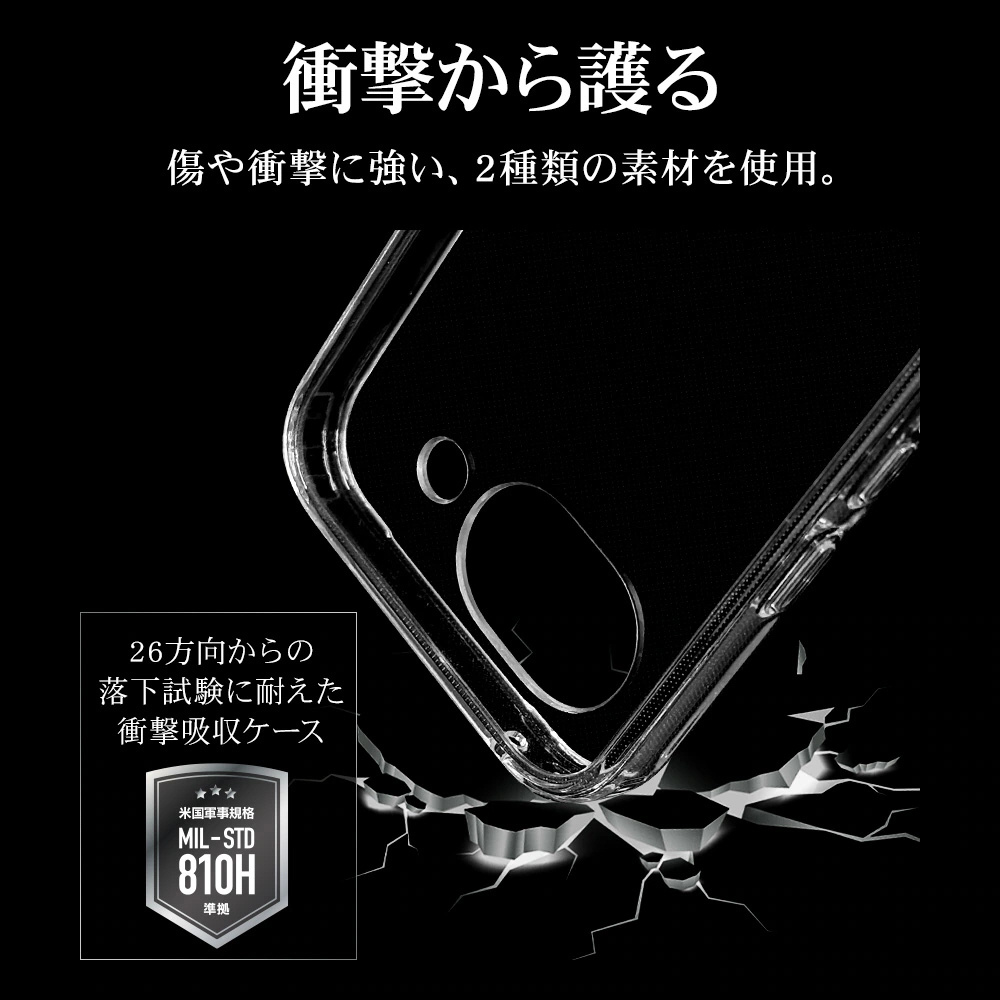 ●側面は弾力と柔軟性を兼ね備えたTPU素材で端末を衝撃から保護し、着脱も簡単です。※衝撃吸収については、一般的なポリカーボネート製ケースと比較した自社検証結果で、無破損、無故障を保証するものではありません。