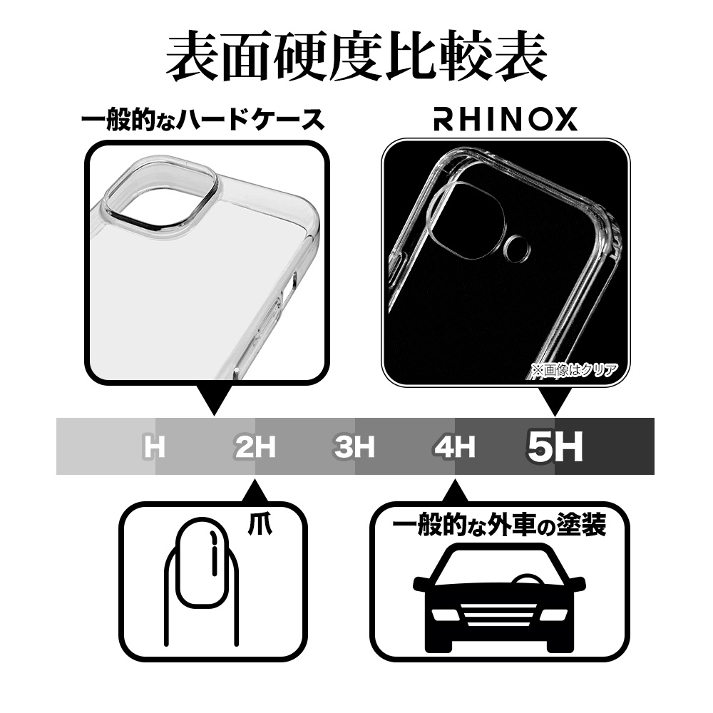 ●表面硬度5Hの傷に強いアクリル素材を背面に採用しています。