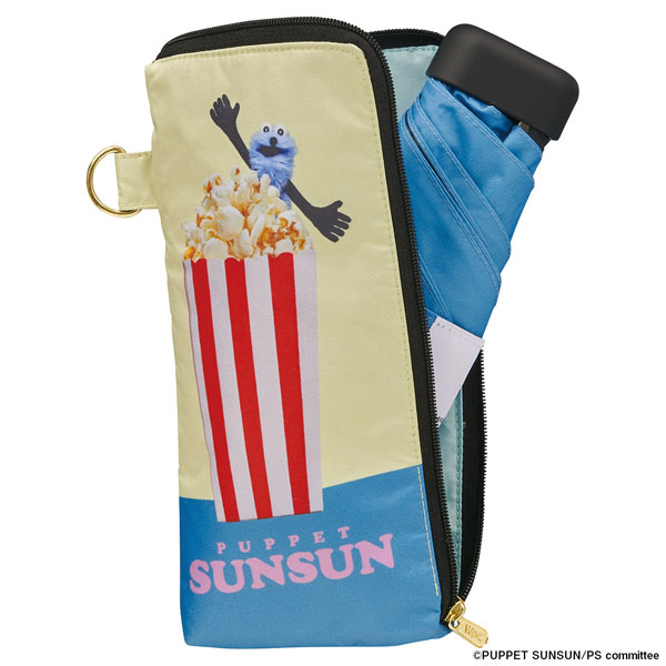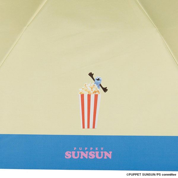 <POPCORN×SUNSUN>ポップコーンの影からのぞくスンスンが愉快で可愛いデザイン!傘本体は、淡いイエローに、ブルーグレーを縁取ったポップなカラーリング。