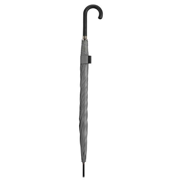 レザー(合皮)の持ち手にエンボス加工を施した、大人向けのシックな長傘。開いたときの直径が約112cmと大きめサイズなので、男性でもしっかりとカバーしてくれるサイズ感。手元はしっとりと手になじむ質感で、握るたびに上品さを感じられます。帯部分にも同じエンボス加工を施し、開く瞬間から閉じる所作まで美しく見せるデザインに仕上げました。