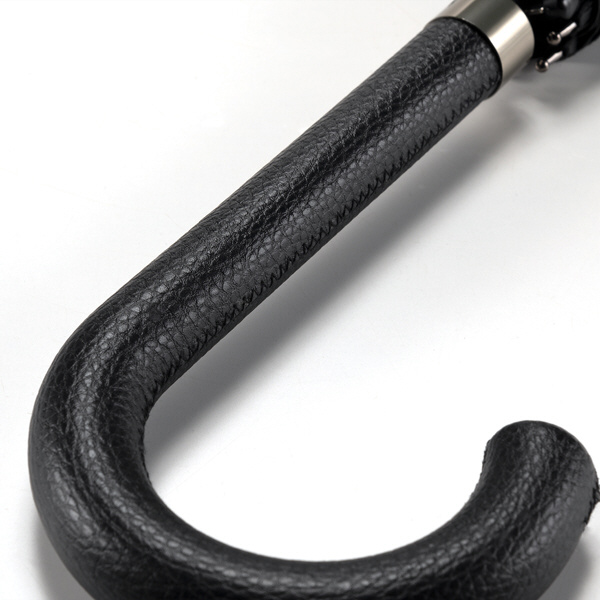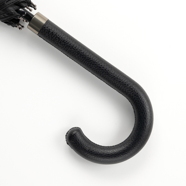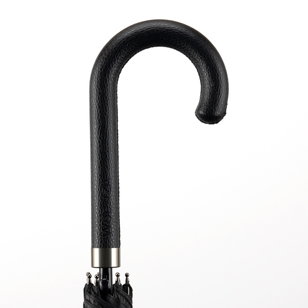 レザー(合皮)の持ち手にエンボス加工を施した、大人向けのシックな長傘。開いたときの直径が約112cmと大きめサイズなので、男性でもしっかりとカバーしてくれるサイズ感。手元はしっとりと手になじむ質感で、握るたびに上品さを感じられます。帯部分にも同じエンボス加工を施し、開く瞬間から閉じる所作まで美しく見せるデザインに仕上げました。