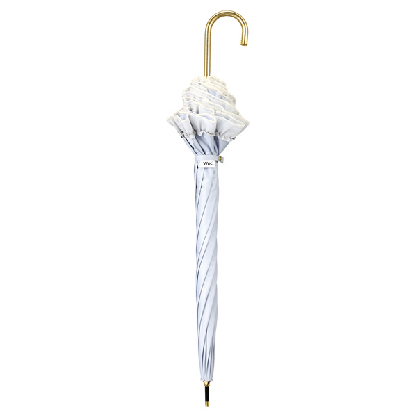 オーガンジーのフリルを重ね、程よくボリュームのあるシルエットに仕上げました。ゴージャスになりすぎない、持ちやすいベーシックカラーで軽やかな印象の日傘。持ち手には上品なゴールド合皮を採用し、大人らしい品の良さと可愛らしさを両立した一本です。