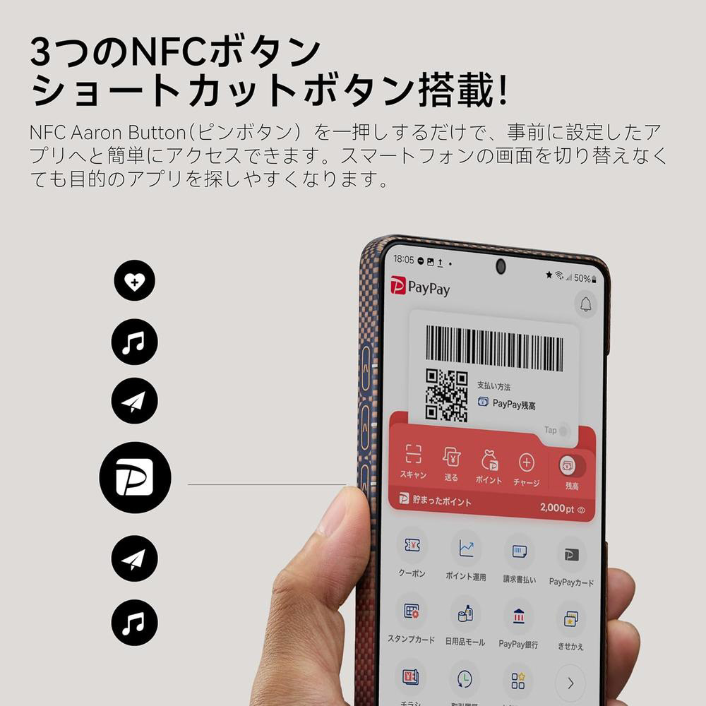 ケース側面に搭載された3つのタッチボタン「Aaron Button(アーロン ボタン)」は、PITAKA独自の画期的システムです。