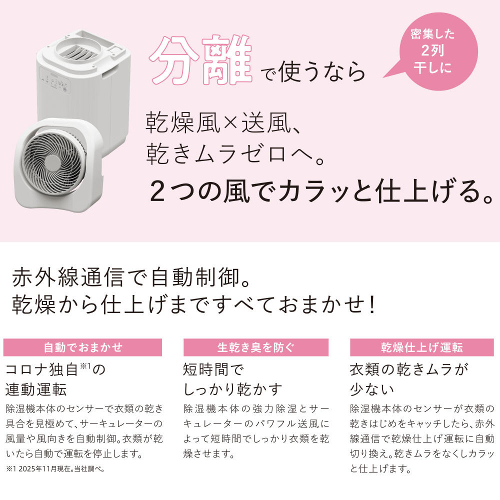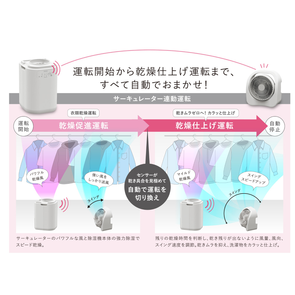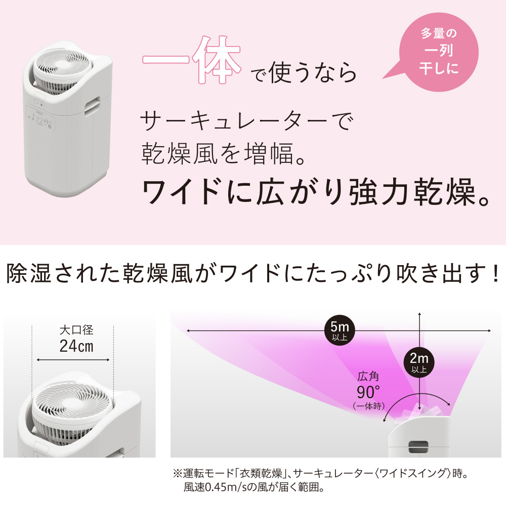 こんなの欲しかった…をカタチにしました。家事の新しいパートナー2WAY衣類乾燥除湿機。<BR>暮らしに合わせた干し方も離れワザで自由自在。サーキュレーターと除湿機のダブルパワーでスピード衣類乾燥。<BR>サーキュレーター一体型運転で乾燥風がワイドに広がり強力乾燥。<BR>分離で使うなら除湿機とサーキュレーターの2つの風でプレミアム乾燥。<BR>サーキュレーター連動運転で運転開始から乾燥仕上げ運転まで、全て自動でおまかせ。<BR>DC送風モーター搭載+コンプレッサー式で電気代もお得!約72分のスピード衣類乾燥!<BR>270Wヒーター搭載で冬でもヒーター温風とサーキュレーター連動で除湿&衣類乾燥。<BR>サーキュレーター単独運転も可能で1年中活躍。<BR>サーキュレーターの送風到達距離6m。<BR>サーキュレーターのガードと羽根は取り外し可能でお手入れラクラク。<BR>こだわりのビッグタンク、たっぷり3.6Lで水捨て回数が少ない。<BR>熱交換器アルミフィンにクリアフィンコートを採用し、抗菌・防カビ仕様の熱交換器。
