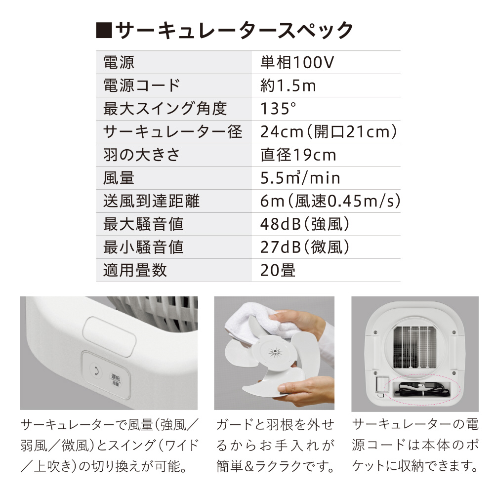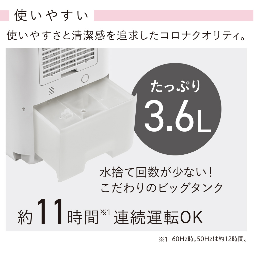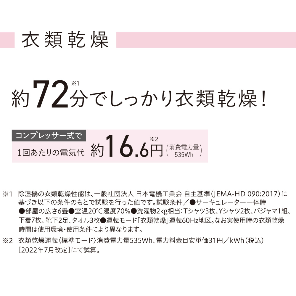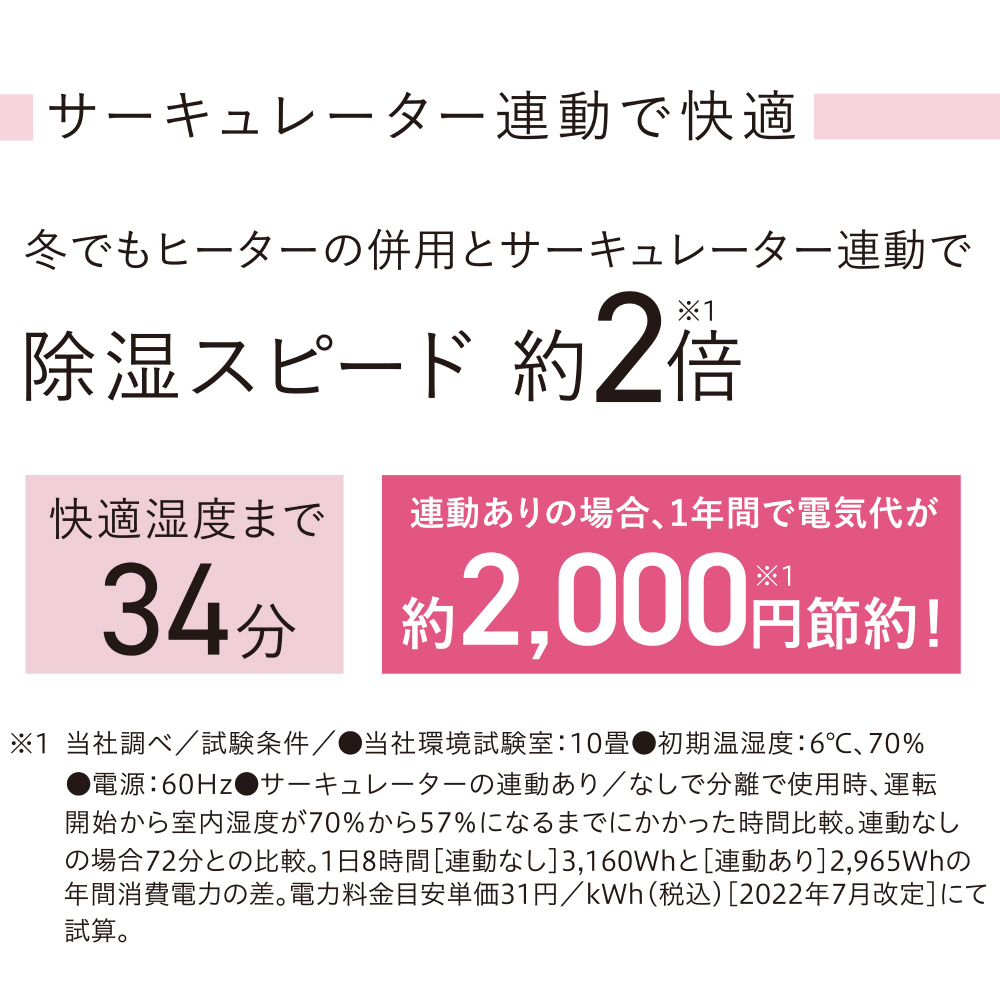 こんなの欲しかった…をカタチにしました。家事の新しいパートナー2WAY衣類乾燥除湿機。<BR>暮らしに合わせた干し方も離れワザで自由自在。サーキュレーターと除湿機のダブルパワーでスピード衣類乾燥。<BR>サーキュレーター一体型運転で乾燥風がワイドに広がり強力乾燥。<BR>分離で使うなら除湿機とサーキュレーターの2つの風でプレミアム乾燥。<BR>サーキュレーター連動運転で運転開始から乾燥仕上げ運転まで、全て自動でおまかせ。<BR>DC送風モーター搭載+コンプレッサー式で電気代もお得!約72分のスピード衣類乾燥!<BR>270Wヒーター搭載で冬でもヒーター温風とサーキュレーター連動で除湿&衣類乾燥。<BR>サーキュレーター単独運転も可能で1年中活躍。<BR>サーキュレーターの送風到達距離6m。<BR>サーキュレーターのガードと羽根は取り外し可能でお手入れラクラク。<BR>こだわりのビッグタンク、たっぷり3.6Lで水捨て回数が少ない。<BR>熱交換器アルミフィンにクリアフィンコートを採用し、抗菌・防カビ仕様の熱交換器。