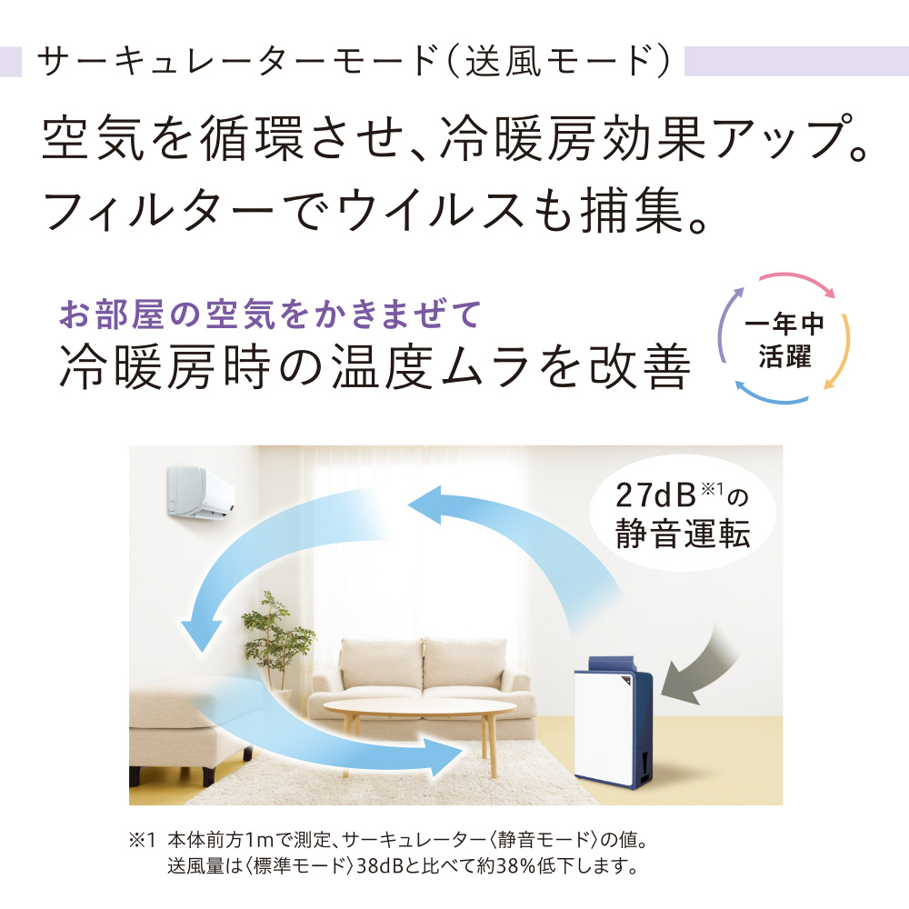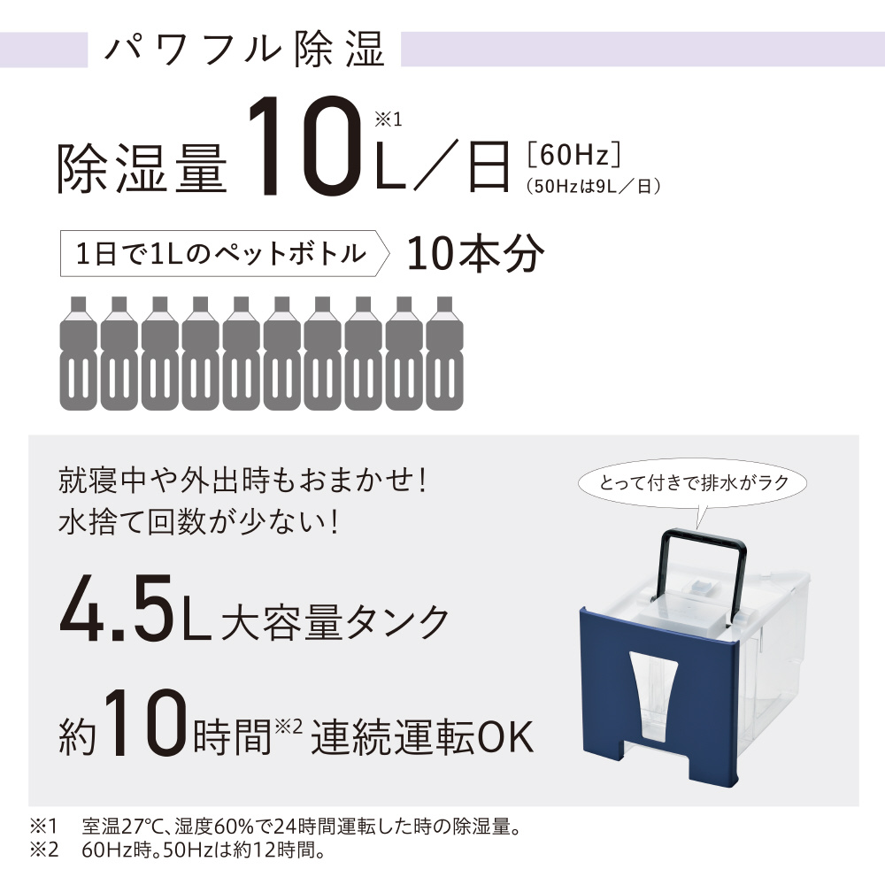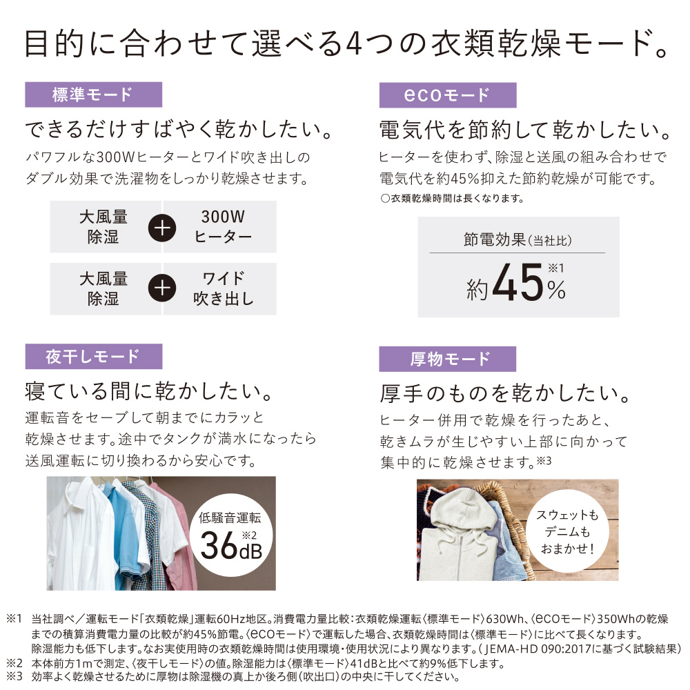 シーンに合わせて選べる4つの最適衣類乾燥モード。<BR>広いリビングや複数のお部屋も強力除湿。<BR>DC送風モーター搭載+コンプレッサー式で低消費電力!お得に除湿ができます。<BR>水捨て回数が少ない4.5L大容量タンク。<BR>ウイルス抑制・除菌・脱臭10年交換不要フィルター搭載でフィルターで捕集したウイルス・菌・タバコのニオイを抑制<BR>冬モード搭載でヒーターを併用したパワフルな除湿運転<BR>5段階湿度設定でお好みの湿度で快適除湿<BR>クリアフィンコート搭載で熱交換器に汚れがつきにくく落ちやすい!<BR>サーキュレーターモード搭載で冷暖房時の温度ムラを改善