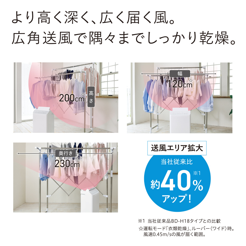 300Wヒーター温風と速乾Wルーバーで業界トップクラスのスピード衣類乾燥。<BR>新開発の速乾Wルーバーで、より高く、広く届く風で部屋干しを快適に!<BR>シーンに合わせて、標準・eco・集中速乾の3つの衣類乾燥モード。<BR>業界初の清潔機能、アクアドロップ洗浄セルフ搭載。コップ1杯の水で熱交換器に付着したホコリや汚れを洗い流す!<BR>水捨て回数が少ない5.5Lビッグタンク。<BR>自動内部乾燥機能搭載で、運転後に自動で内部を乾燥し、イヤなのニオイの原因となるカビや細菌の繁殖を抑えます。<BR>4輪キャスター付きで移動もラクラク。<BR>ひと目で操作がわかる、タッチパネル式操作パネル。<BR>サーキュレーターモード搭載で冷暖房時の温度ムラを改善。