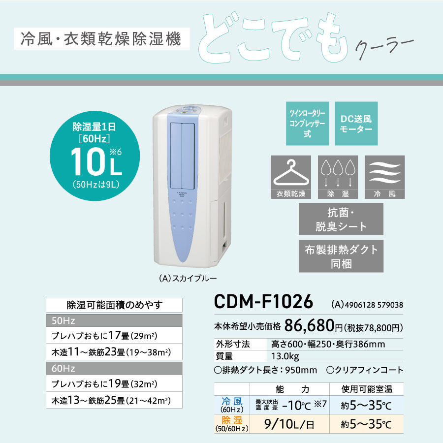 冷風衣類乾燥除湿機 どこでもクーラー スカイブルー CDM-F1026-A [コンプレッサー方式 /木造13畳まで /鉄筋25畳まで]