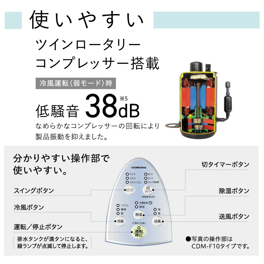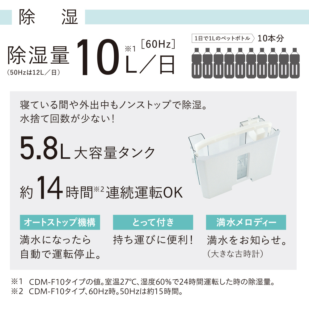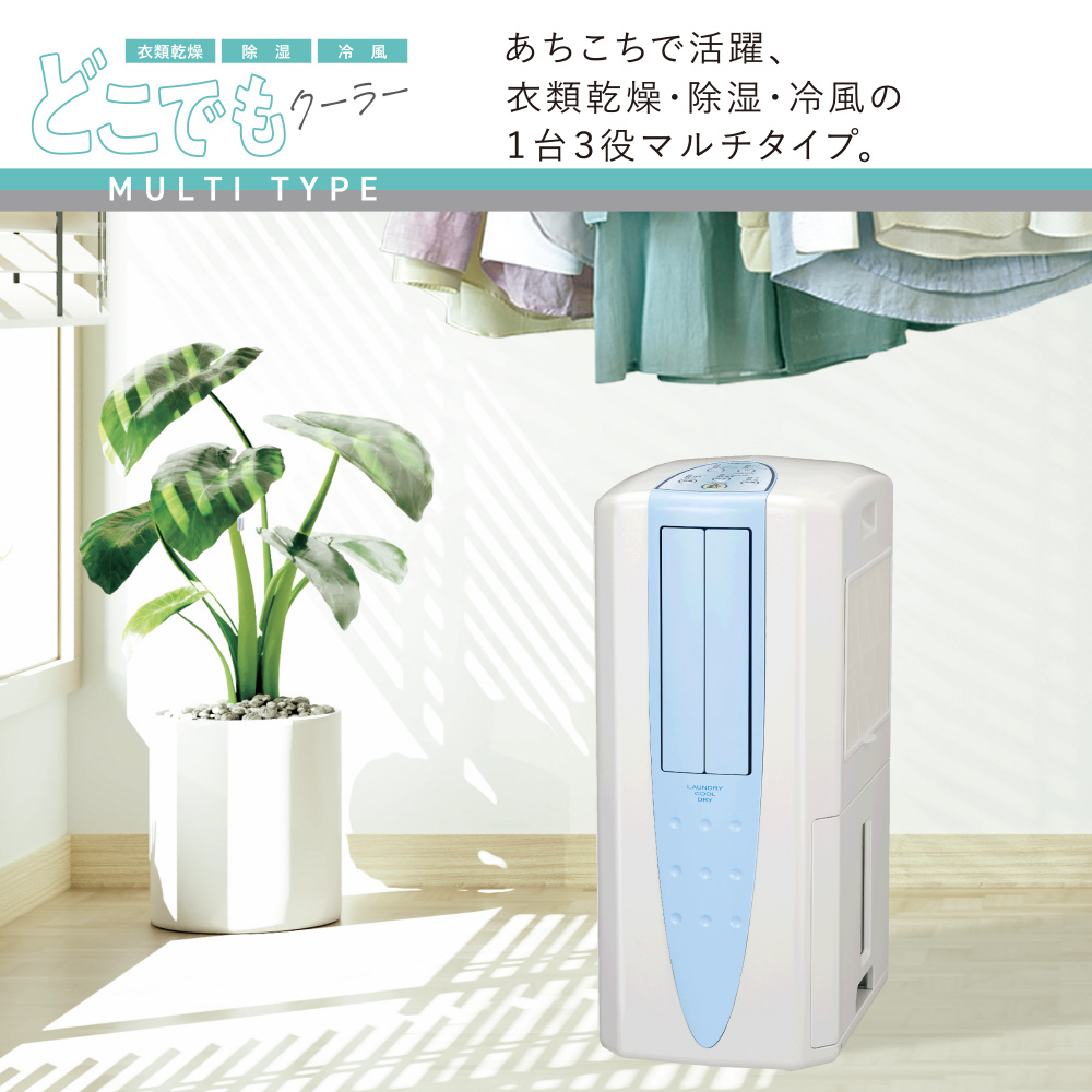 いつでもどこでも使える冷風・衣類乾燥・除湿の1台3役多機能&パワフル。<BR>付属の布製排熱ダクトで背面から出る排熱を室外に出してさらに快適。<BR>クリアフィンコート搭載で、熱交換器に汚れがつきにくく落ちやすい。<BR>4輪自在キャスター付きでどこへでもラクラク移動。<BR>水捨て回数が少ない5.8L大容量タンク、持ち運びにも便利なとって付き。<BR>内部乾燥モードで本体内部をカラッと清潔に。<BR>冷風・衣類乾燥・除湿の機能を簡単に操作できます。