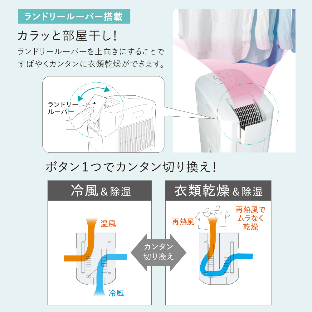 冷風・除湿・衣類乾燥の1台3役で多機能&パワフル。