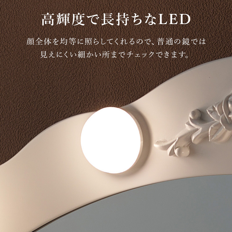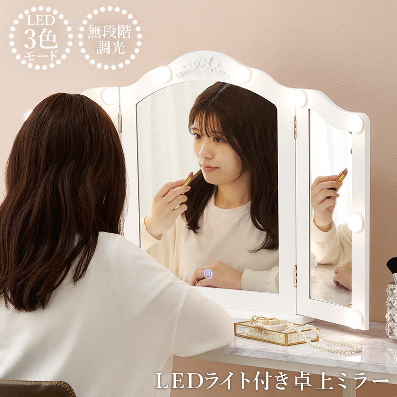 自宅のテーブルに置くだけで、本格的なLEDライト付き三面鏡ドレッサーに。メイクやヘアセットに大活躍。