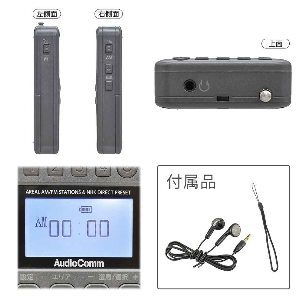 ■ 付属品:ステレオイヤホン、ハンドストラップ、プリセット済み放送局リスト、保証書、取扱説明書