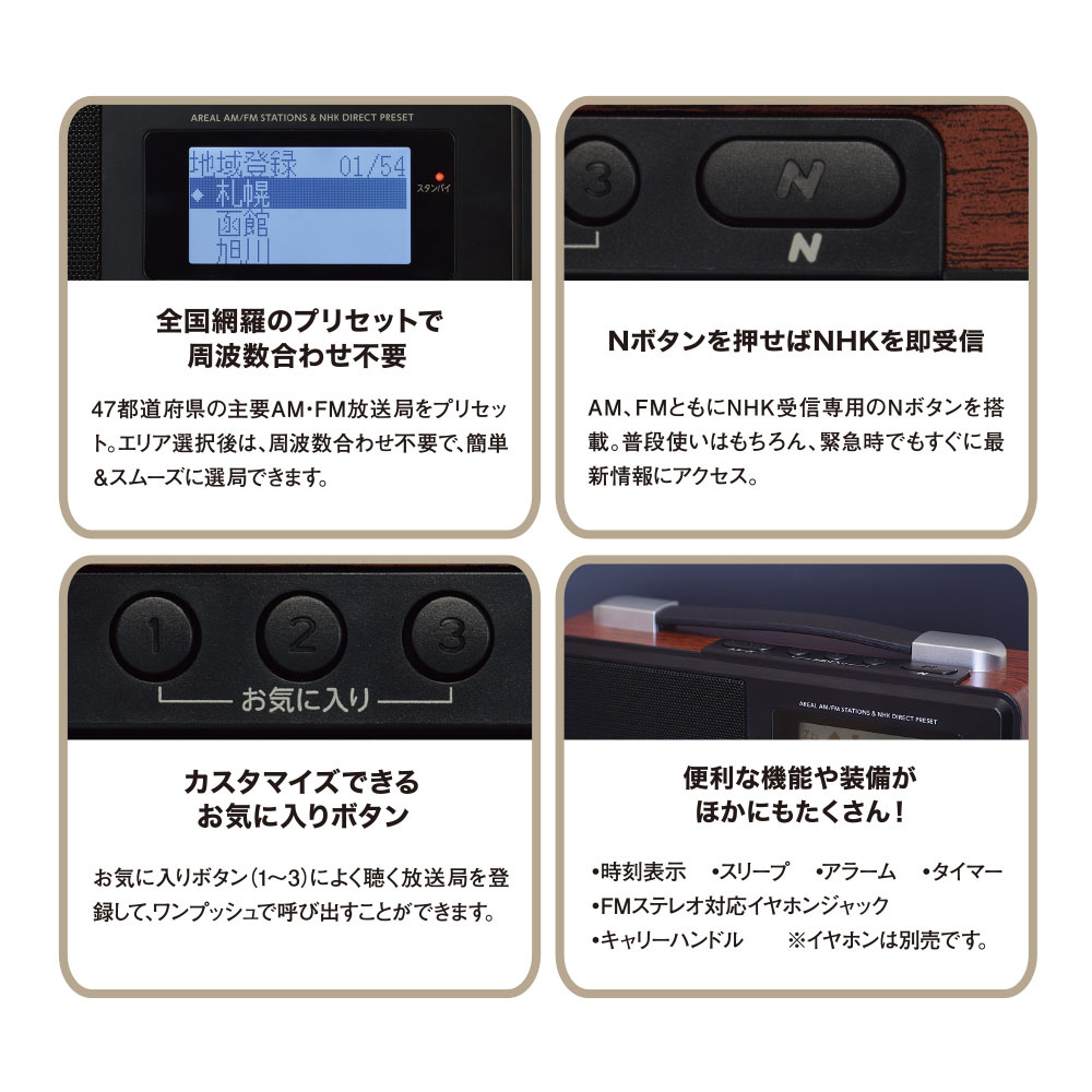 ● AM50局、FM106局を全国の主要ラジオ局をプリセット済みで、周波数合わせ不要