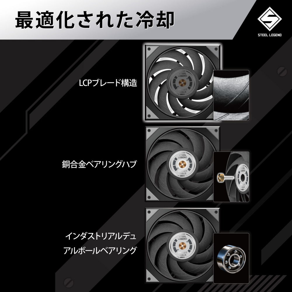 Steel Legendは、一切の妥協を許さない剛健さと、長期にわたる高い信頼性を象徴する存在です。 産業グレードのデュアルボールベアリングと航空宇宙グレードのLCPファンブレードにより、揺るぎない冷却性能と優れた耐久性を発揮し、まさに“鋼から鍛え上げられた真の伝説”と言えるでしょう。