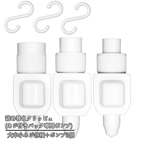 「ネジ付きパウチ専用」詰め替えパック大容量モデル 「大ネジ・中ネジ・小ネジ:各1個(合計3個)」+「ポンプ:3個」セット 詰め替えクリッヒ゜ュ ホワイト ホワイト TCD3-W