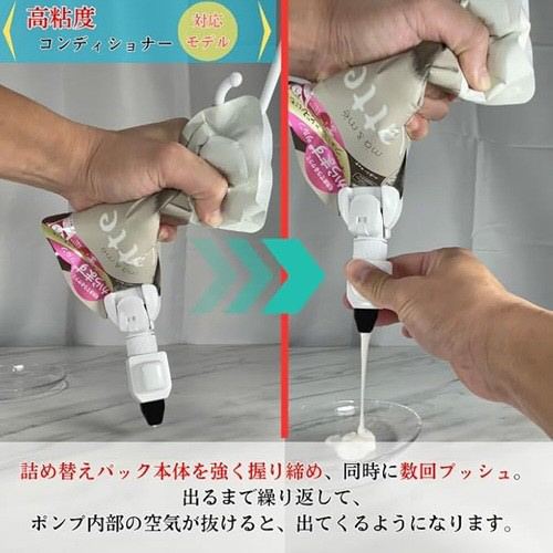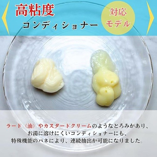 ◆高粘度対応詰め替えクリッピュ:ラード(油)やカスタードクリームのようなとろみがあり、お湯に溶けにくいコンディショナーにも、特殊機能のバネにより、連続抽出が可能になりました!