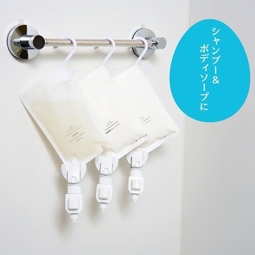 ある程度の大容量タイプの詰替え用リフィルもぶら下げ可能ですが、容量が2.5リットルを越える場合はご使用を控えてください。