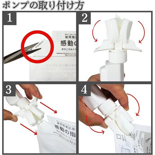大容量タイプ(2回分以上)などに多いネジ付きタイプは、ネジが付いて「ない」側を、15〜20(mm)以内ハサミで切ってから、ポンプを取り付けてください。